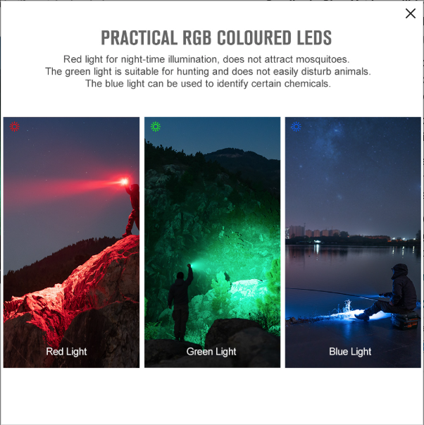 -Uniformly Distributed RGB Color LEDs: Three RGB LEDs are uniformly distributed around the lens, greatly increasing its usefulness on any outdoor adventure.